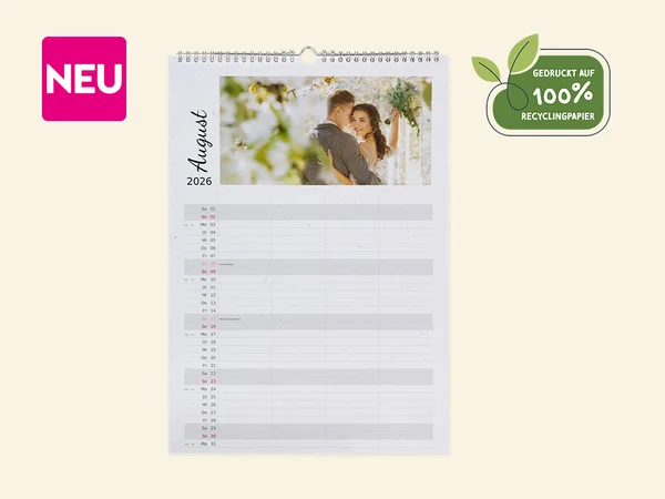 Die Kalender Naturgebunden erweitern unser umweltbewusstes Angebot perfekt. Bei ihnen besteht das Papier ebenfalls zu 100 % aus Blauer Engel zertifiziertem Recyclingpapier, sodass auch hier hohe Umweltstandards erfüllt werden.