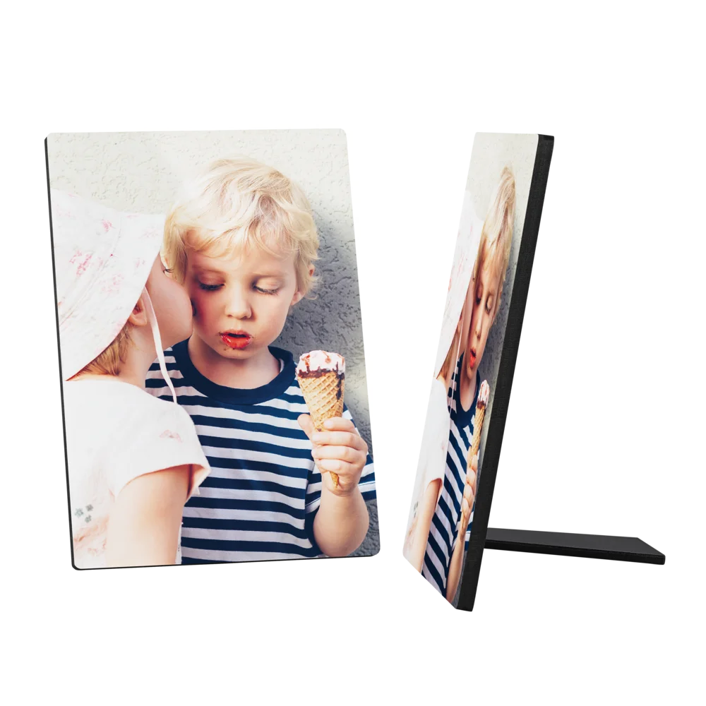Der Aufsteller besteht aus einer stabilen Holzfaserplatte mit glänzender Beschichtung und einem flexiblen Standfuß. Aufgrund der Technologie sind die Bilder kratzfest, lichtbeständig und vergilben nicht – auch nach Jahren nicht. Einfach mit Glasreiniger oder Alkohol zu säubern. Die Panels, die sich als Tischdeko eignen, sind recycelbar und aus recyceltem Material gefertigt.