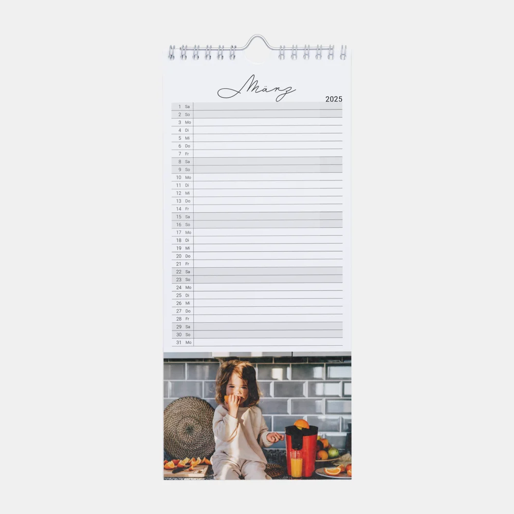 Schlank, praktisch und dekorativ: Der Küchenkalender im Format 13 × 30 cm sorgt für Übersicht und Organisation im Alltag. Jede Monatsseite bietet viel Platz für Eintragungen, während Ihre Fotos im Digitaldruck mit matter Oberfläche relfexionlos und klar erscheinen. Durch die Spiralbindung mit Aufhänger lässt er sich einfach umblättern und sicher befestigen. Der frei wählbare Startmonat macht den Kalender flexibel – ideal, um persönliche Erinnerungen jederzeit in Szene zu setzen und gleichzeitig einen praktischen Alltagshelfer zu gestalten.