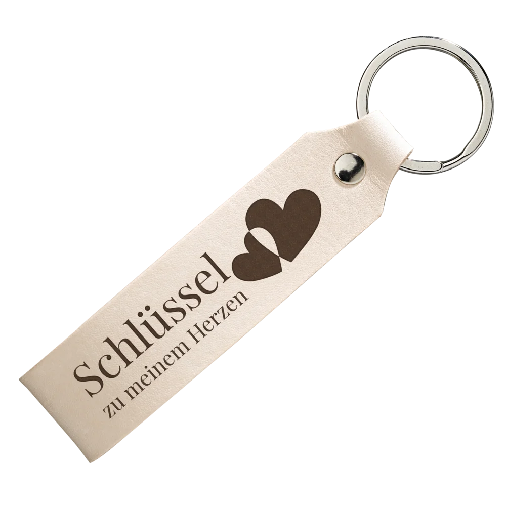Dekorativer Schlüsselanhänger aus hellem, beigefarbenen Leder. Ergänzt zum Beispiel mit Ihrem persönlichen Lebensmotto ist er stets ein treuer Begleiter. Der individuelle Ordnungshelfer für Sie oder als Geschenk für Ihre Liebsten - inklusive Schlüsselring.