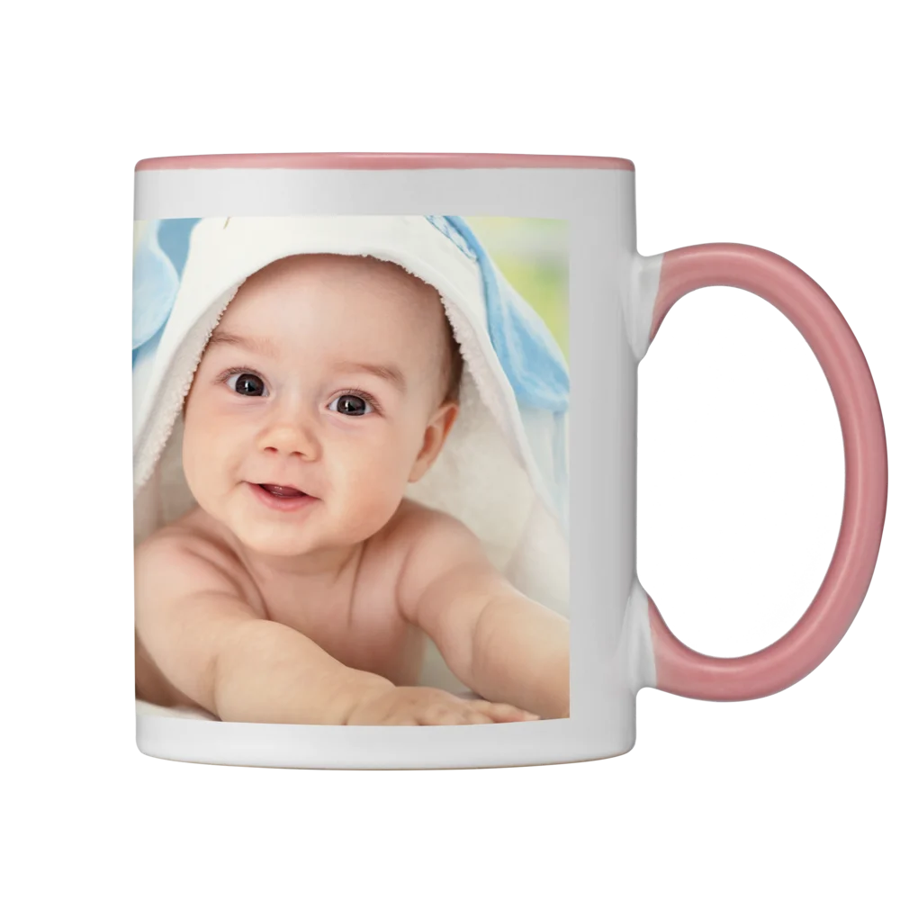 Die Tasse besitzt einen farbigen Henkel und Trinkrand. Dies bietet einen schönen Farbakzent passend zu jedem Motiv. Folgende Farben sind möglich: Gelb, Orange, Rot, Weinrot, Pink, Hellblau, Blau, Hellgrün, Grün, Schwarz.