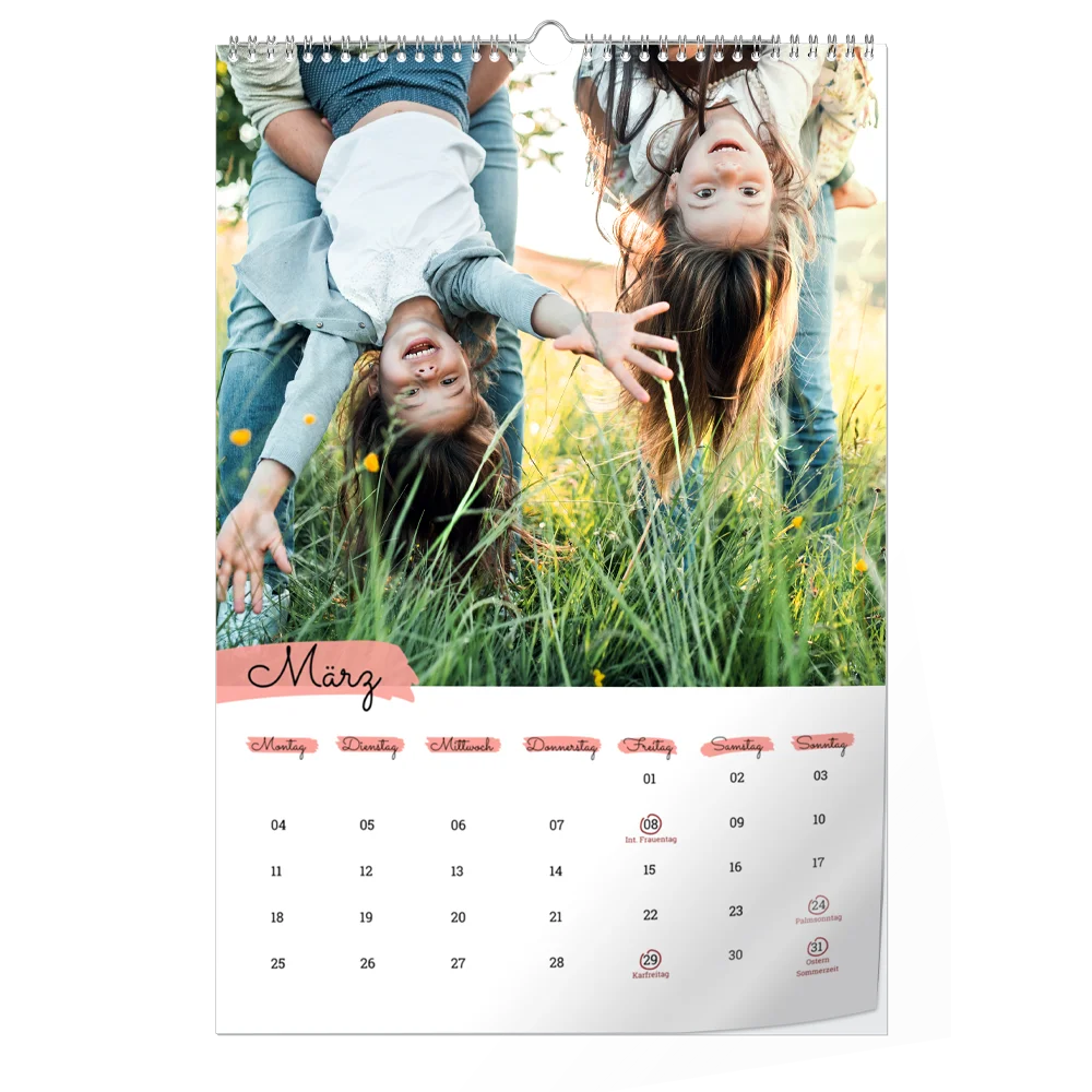 Mit Ihrem persönlichen Wandkalender erfreuen Sie sich Monat für Monat an Ihren schönsten Erinnerungen. Gestalten Sie Ihr Jahr ganz nach Ihren Wünschen – ob mit Urlaubsfotos oder Bildern Ihrer lieben Familie – Ihr persönlicher Kalender wird zum Blickfang in Ihrer Wohnung. Die beeindruckende Farbtiefe und die gestochene Schärfe machen Ihren Kalender zu einem echten Hingucker. Bestehend aus 13 Einzelseiten (Deckblatt + 12 Monate) seidenmattem Papier und hergestellt im hochwertigen Digitaldruckverfahren bietet Ihr Kalender reichlich Platz für Notizen und Termineinträge. Die stabile Spiralbindung ermöglicht einfaches Umblättern zwischen den Monaten.